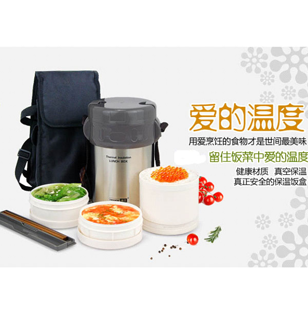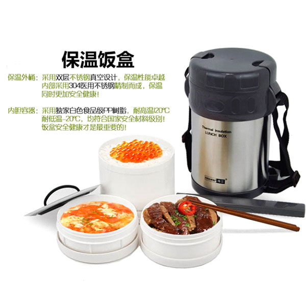 材質(zhì):保溫外桶采用不銹鋼雙層真空結(jié)構(gòu),內(nèi)層為304醫(yī)用不銹鋼(一體成型) 內(nèi)膽材質(zhì),獨家白色食品級PP樹脂(耐高溫120℃,耐低溫-20℃) 規(guī)格:1、總 體: 直徑--14.2厘米; 高 --22.5厘米; 重量--1068克 2、菜容器:直徑 --12.0厘米;高 -- 5.0厘米;容量 --0.4升 3、飯容器:直徑 --12.0厘米;高 -- 9.0厘米;容量 --0.69升 4、菜容器:直徑 --12.0厘米;高 -- 4.5厘米;容量 --0.32升 適用范圍:個人專用;郊游攜帶;醫(yī)院探病等