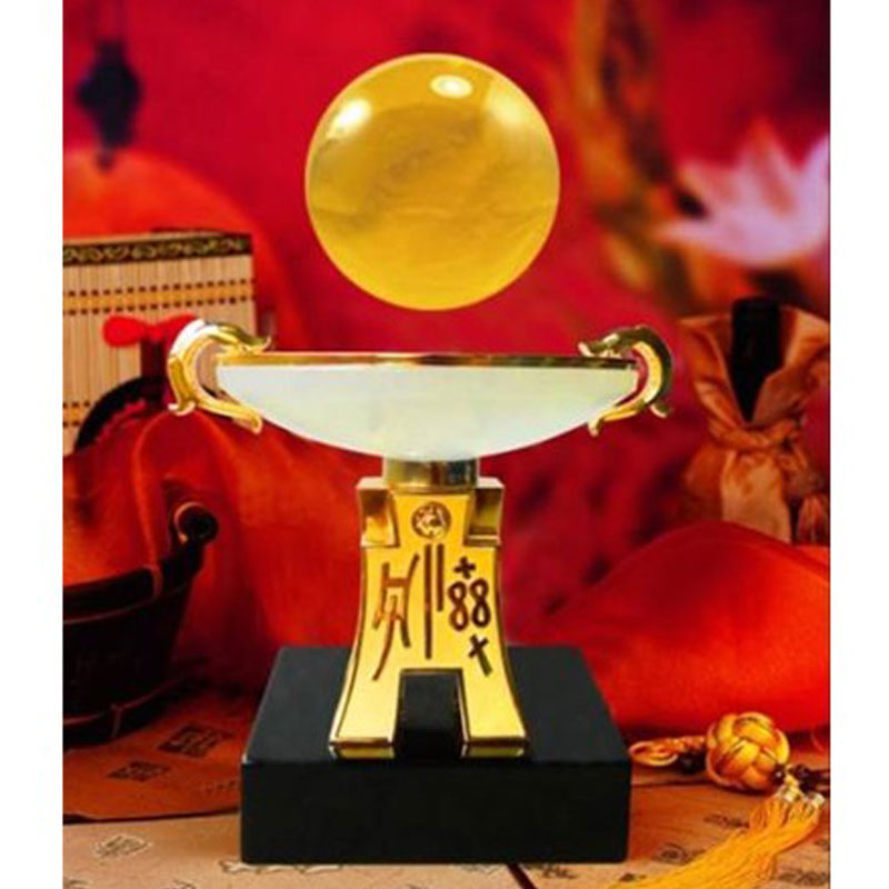 產品名稱:聚寶盆-小號風水球 球體尺寸:100mm×100mm; 底坐尺寸:182mm×200mm; 產品材質:琉璃,金屬合金,木質底盤。