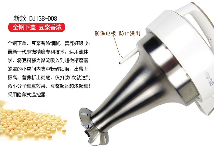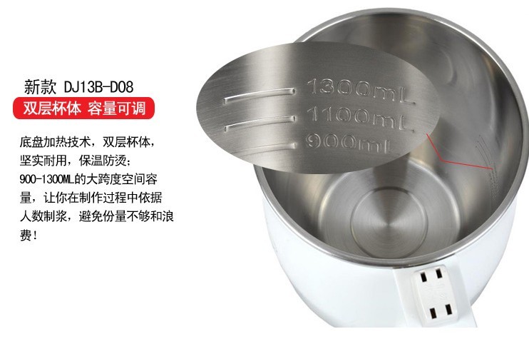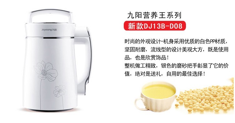 產品名稱:九陽 家電品牌:九陽豆漿機 型號:DJ13B-D08 容積:1L-1.5L 豆漿機功能:干豆 濕豆 五谷 果蔬 杯體材質:不銹鋼杯體 是否有網:有網 豆漿機功率:750W及以下 豆漿機加熱方式:底盤加熱 自動清洗功能:有 適用人數:4-5人