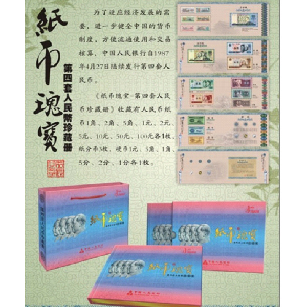 冊內收藏有第四套人民幣紙幣1角、2角、5角、1元、2元、5元、10元、50元、100元等9種面額,紙分幣3枚和硬幣1分、2分、5分各1枚。