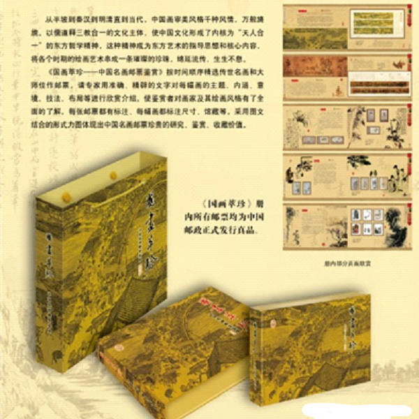 收藏有70枚郵票,其中清明上河圖9枚,洛神賦圖10枚,富春山居圖6枚,敦煌壁畫和永樂宮壁畫各4枚,號國夫人游春圖和神駿圖各2枚,名畫大師石濤、鄭板橋、潘天壽、傅抱石、李可染的作品各6枚及何香凝作品3枚。