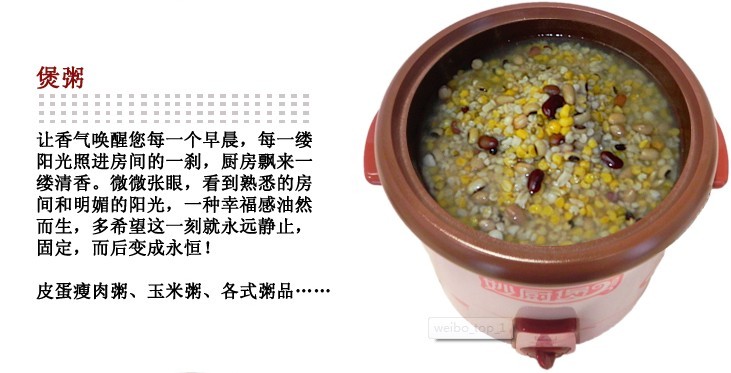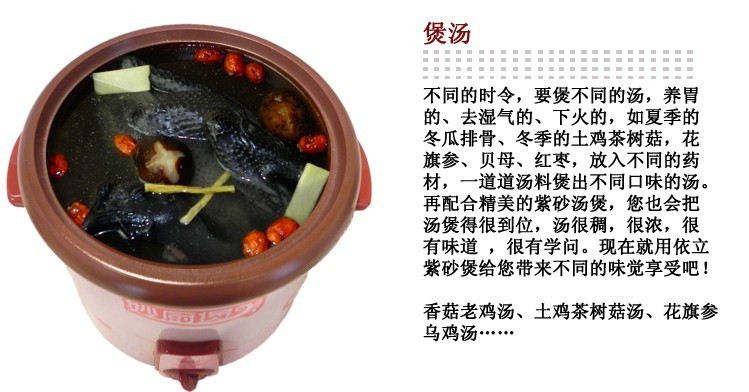 產品名稱:依立 TB49030 品牌:依立 型號:TB49030 控制方式:機械式 鍋煲材質:紫砂鍋煲 功能:煲湯 煮粥 燉 燜 其他 鍋煲容量:3-4L(不含4L) 功率:200-299W 售后服務:全國聯保 預約功能:無 液晶顯示:無