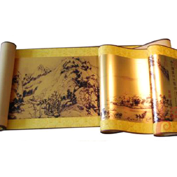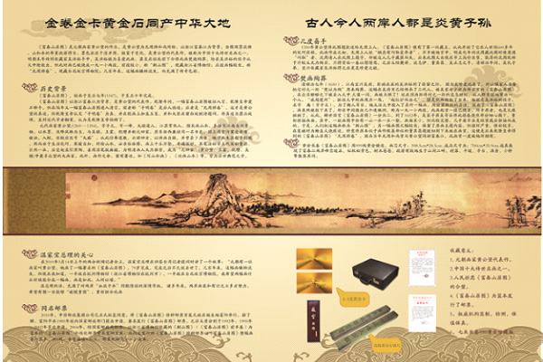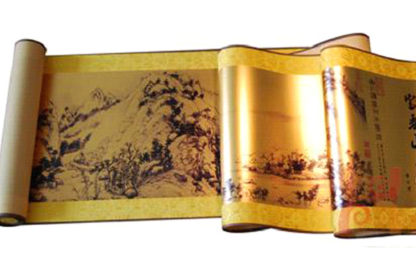 純金卷軸(珍藏版)系純度達99.9%黃金【宣紙】制成,采用高科技的黃金宣紙印刷技術,既能使彩色圖像直接印于黃金宣紙之上,又能保留黃金宣紙原有的特質,既抗氧化,抗變色和防潮防蛀。并采用高級錦綾裱制而成。風格儒雅,品味卓越,蘊涵濃郁的傳統文化氣息,是書畫藝術與絲綢的完美結合,極具觀賞和收藏價值。