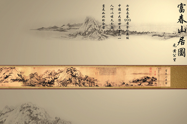 《富春山居圖》是元朝畫家黃公望的作品,是黃公望為無用師和尚所繪,以浙江富春江為背景,全圖用墨淡雅,山和水的布置疏密得當,墨色濃淡干濕并用,極富于變化,是黃公望的代表作,被稱為中國十大傳世名畫之一。明朝末年傳到收藏家吳洪裕手中,吳洪裕極為喜愛此畫,甚至在臨死前下令將此畫焚燒殉葬,險在吳洪裕的侄子從火中搶救出,但此時畫已被燒成一大一小兩段。前段稱《剩山圖》,現藏浙江省博物館;后段較長稱《無用師卷》,現藏臺北故宮博物院.