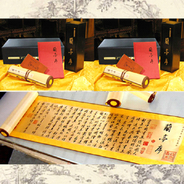 純金版《蘭亭序》金卷軸畫由故宮博物院所藏底版1:1比例精工打造而成,全卷長達7米,高0.35米,印刷在成色99.9的黃金宣紙,制作工藝極其復雜。經過高科技處理后,純金版《蘭亭序》金卷軸畫具備結構嚴密、柔韌光亮、抗氧化、抗變色的永久珍藏特性。集黃金藝術品、繪畫珍品、收藏品為一身,具有極高的藝術和收藏價值。