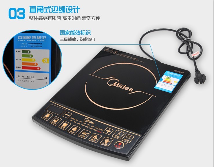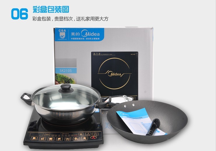 產品名稱:Midea/美的 SK2105 電磁爐品牌:Midea/美的 型號:SK2105 貨號:JYC-21ES70 顏色分類:黑色 電磁爐爐頭:單爐 功能選擇:爆炒 炒菜 燉奶 蒸煮 煮粥 煲湯 火鍋 電磁爐面板類型:黑色微晶面板 磁爐功率:2001-3000W 操作方式:按鍵式 能效等級:3級 火力檔位:8檔 預約功能:無 防水功能:無